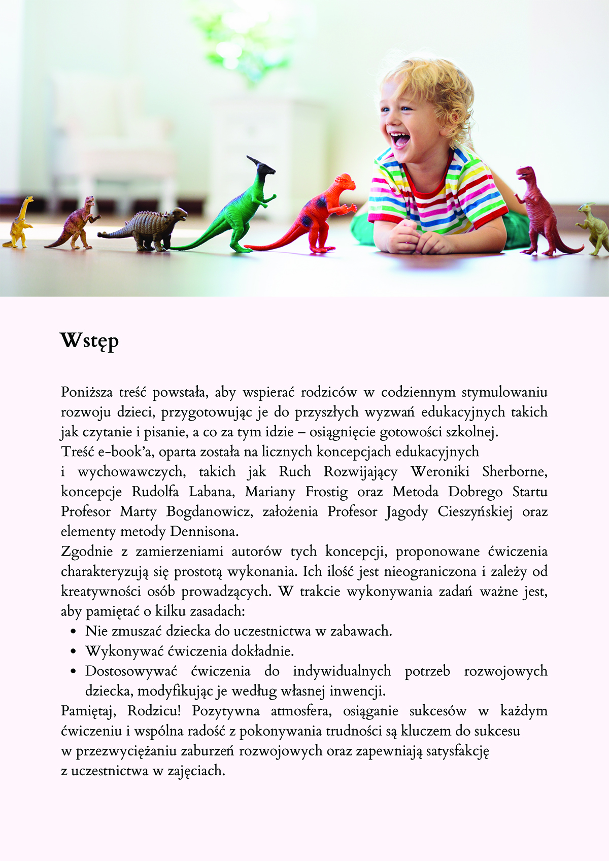 Treść e-book’a oparta została na licznych koncepcjach edukacyjnych i wychowawczych, takich jak Ruch Rozwijający Weroniki Sherborne, Metoda Dobrego Startu Profesor Marty Bogdanowicz, elementy metody Dennisona, koncepcje Rudolfa Labana, Mariany Frostig, założenia Profesor Jagody Cieszyńskiej.